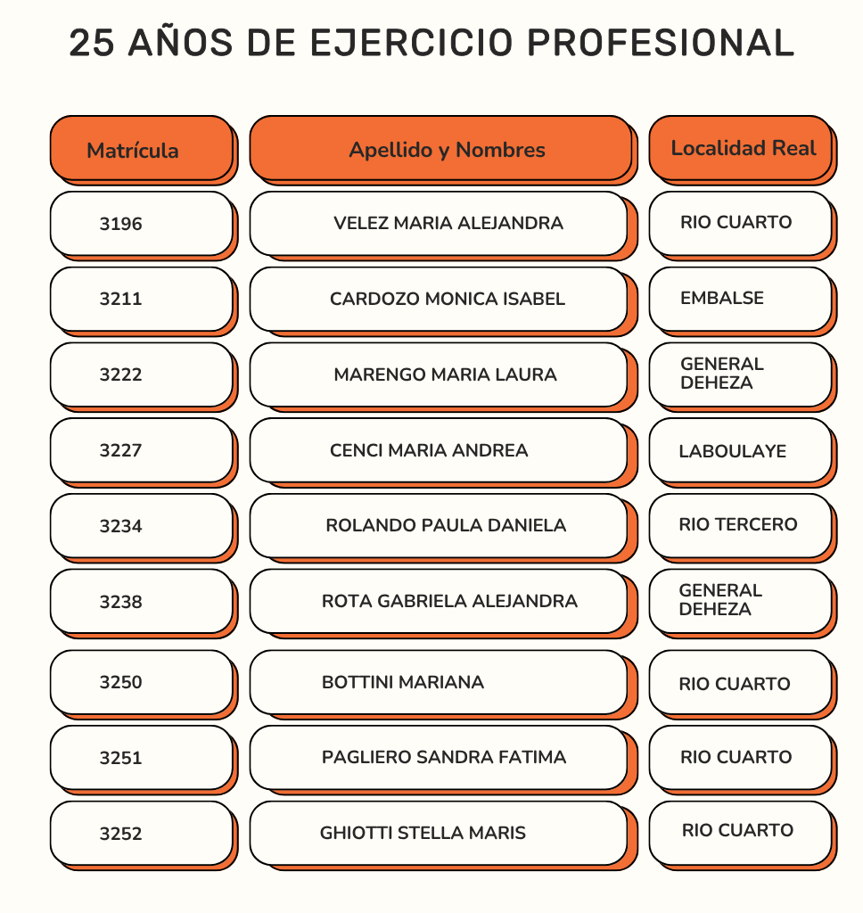 En este día del Psicólogo/a, la Delegación Regional Río Cuarto del Colegio de Psicólogos felicita a las/os colegas que se matricularon en el año 2000. Celebramos y reconocemos con profundo respeto los 25 años de Ejercicio Profesional de la Psicología que con dedicación, ética y compromiso han desarrollado en nuestra comunidad y en la región.