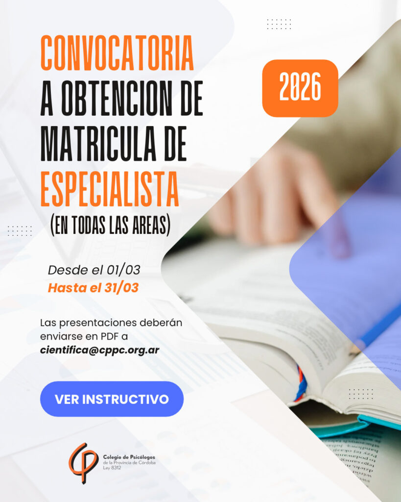 El Colegio de Psicólogos de la Provincia de Córdoba con el fin de promover y reconocer la formación de sus matriculados, abre la convocatoria a la presentación de documentación para la obtención de Matrícula Especialista desde el día 01 de marzo hasta el 31 de marzo.
