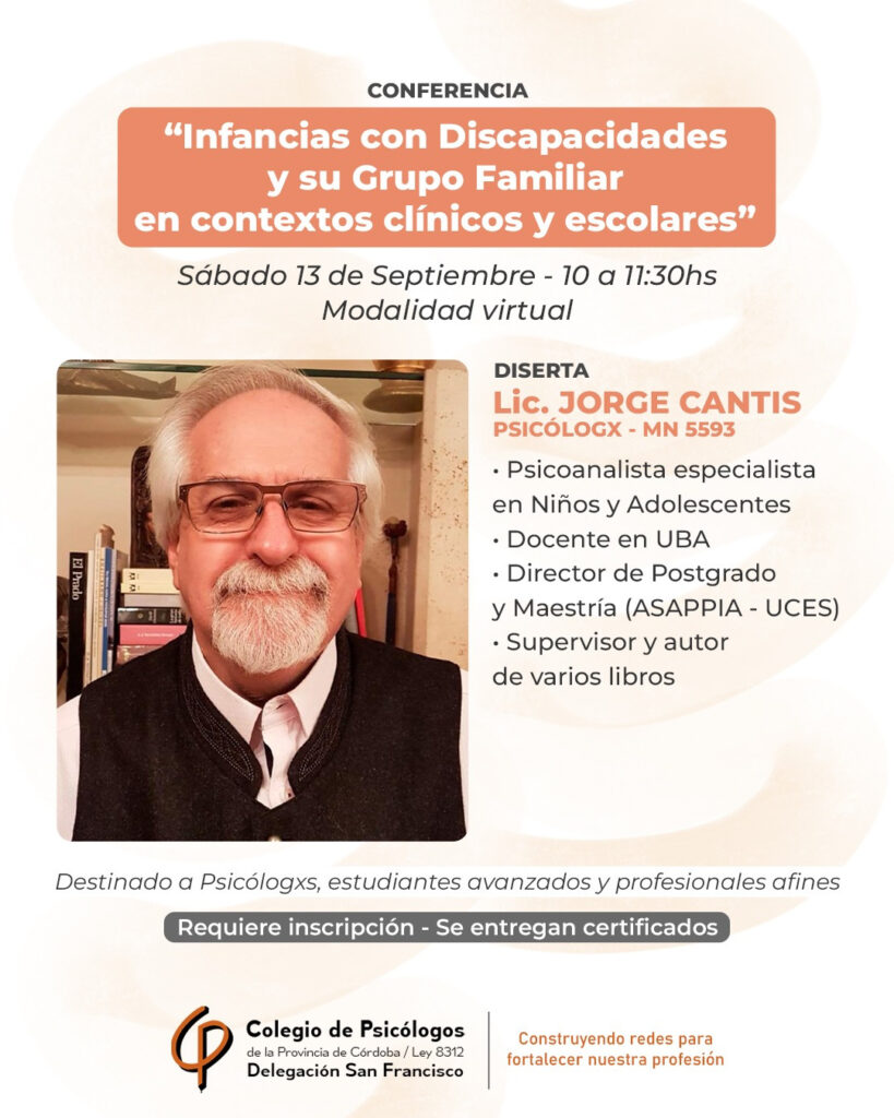 Conferencia: “Infancias con Discapacidades y su Grupo Familiar en contextos clínicos y escolares” disertado por el psicólogx Lic. Jorge Cantis – MN 5593 📚