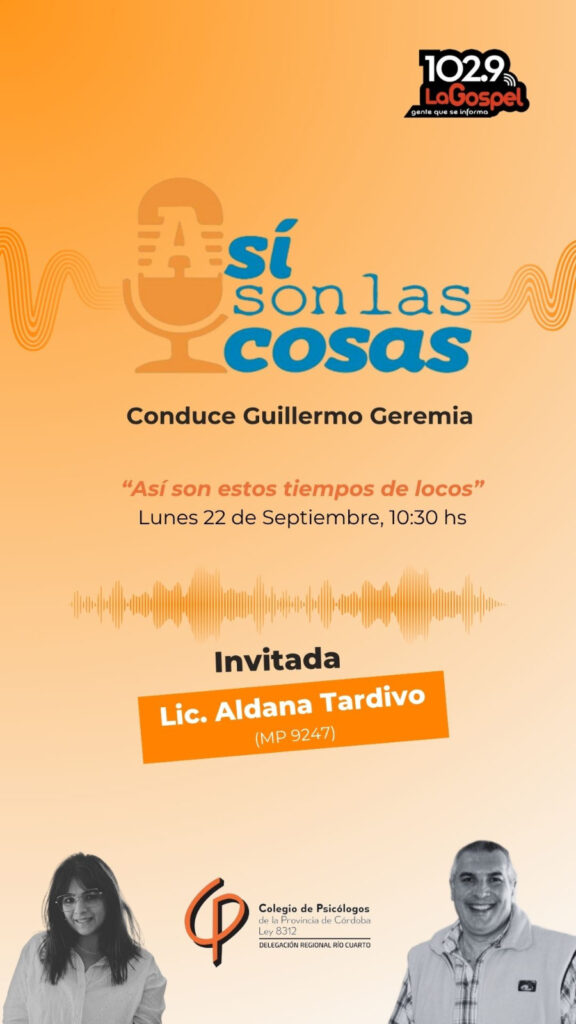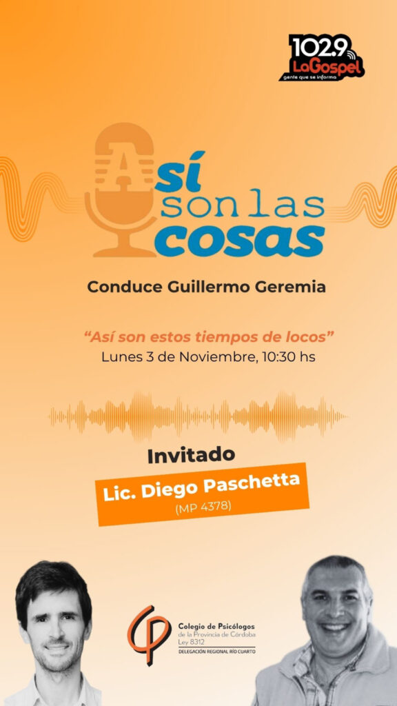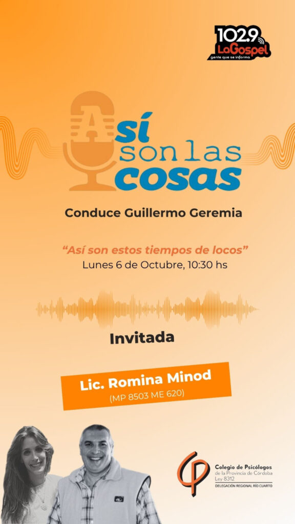En el programa “Así son las cosas”, conducido por Guillermo Geremia, la Lic. Romina Minod (MP 8503 ME 620) aborda desde una perspectiva psicoanalítica las elecciones y sus implicancias en el sujeto, a propósito del Ciclo de Cine y Psicoanálisis que se desarrolla en Río Cuarto con el auspicio de la Delegación Regional Río Cuarto del CPPC.