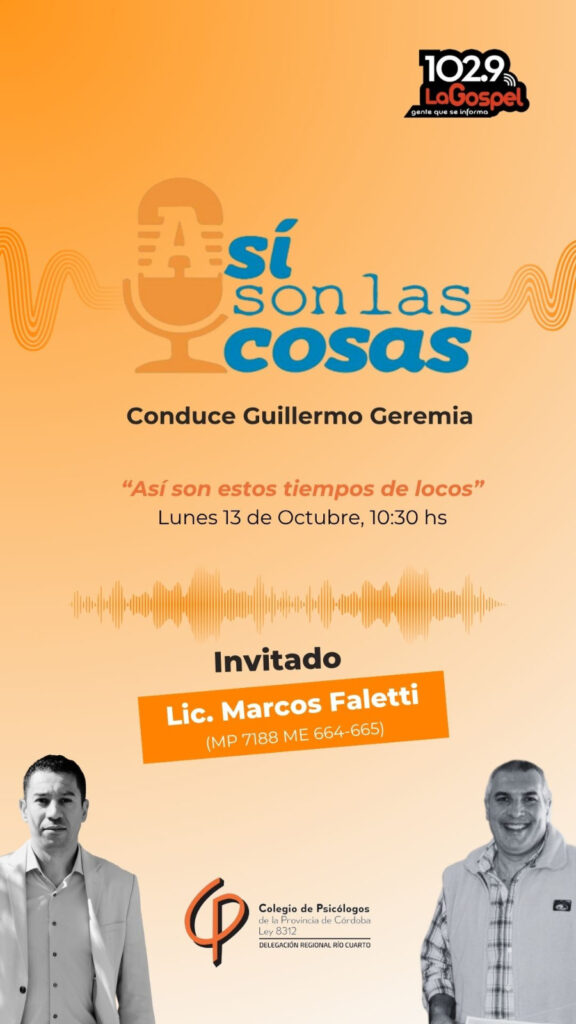 En el programa “Así son las cosas”, conducido por Guillermo Geremia, el Lic. Marcos Faletti (MP 7188 ME 664-665) dialoga sobre la importancia de hablar de salud mental en los medios de comunicación.