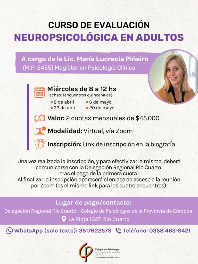 Desde la Delegación Regional Río Cuarto del Colegio de Psicólogos de la Provincia de Córdoba, nos complace anunciar la apertura de inscripciones para el Curso de Evaluación Neuropsicológica en Adultos, una propuesta de formación orientada a profundizar en una de las áreas de mayor relevancia y crecimiento dentro de la práctica profesional.