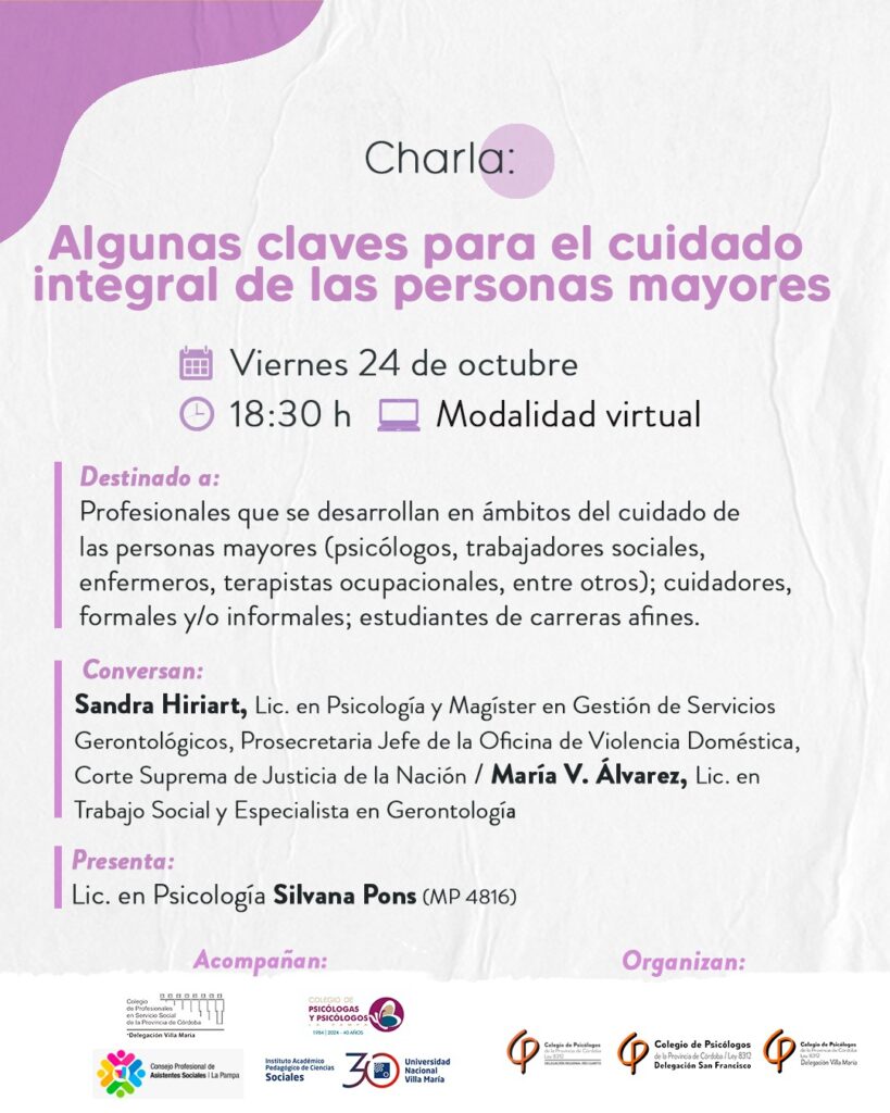En el marco de Octubre, mes de la salud mental, te invitamos a participar de un encuentro virtual sobre el cuidado integral de las personas mayores, organizado por las Delegaciones San Francisco, Río Cuarto y Villa María del CPPC.
