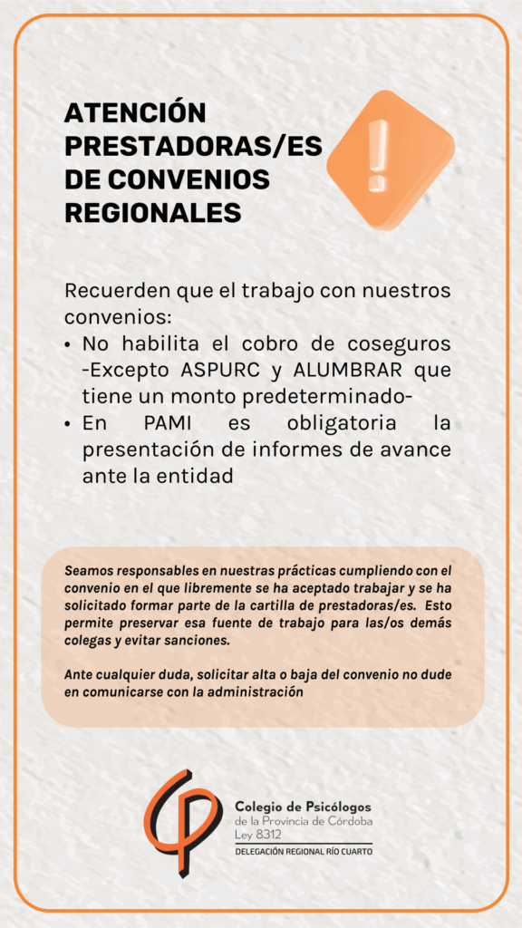 Desde la Delegación Regional Río Cuarto del Colegio de Psicólogos recordamos la importancia de sostener prácticas éticas y responsables en el marco de los convenios vigentes.