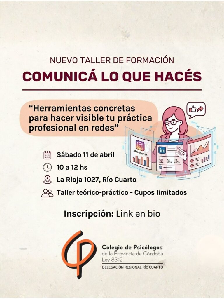 La Delegación Regional Río Cuarto del Colegio de Psicólogos de la Provincia de Córdoba invita a las/os colegas matriculadas/os a participar del taller «Comunicá lo que hacés», una propuesta práctica orientada a fortalecer la presencia profesional en redes sociales.