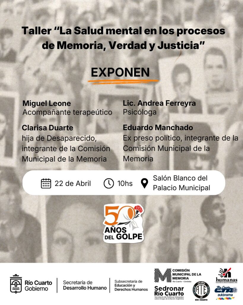 La Delegación Regional Río Cuarto del Colegio de Psicólogos de la Provincia de Córdoba invita a las/os colegas a participar del taller «La Salud Mental en los procesos de Memoria, Verdad y Justicia», organizado por la Comisión Municipal de la Memoria en el marco del 24 de Marzo – Día Nacional de la Memoria, por la Verdad y la Justicia, a 50 años del golpe cívico militar.